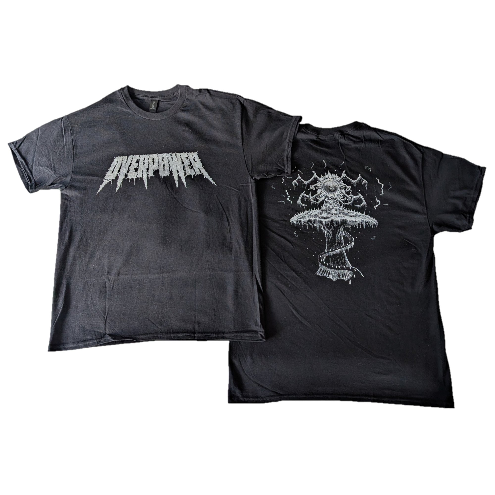 Overpower Logo with Becoming the Tyrant Artwork on Black Gildan Heavy Cotton